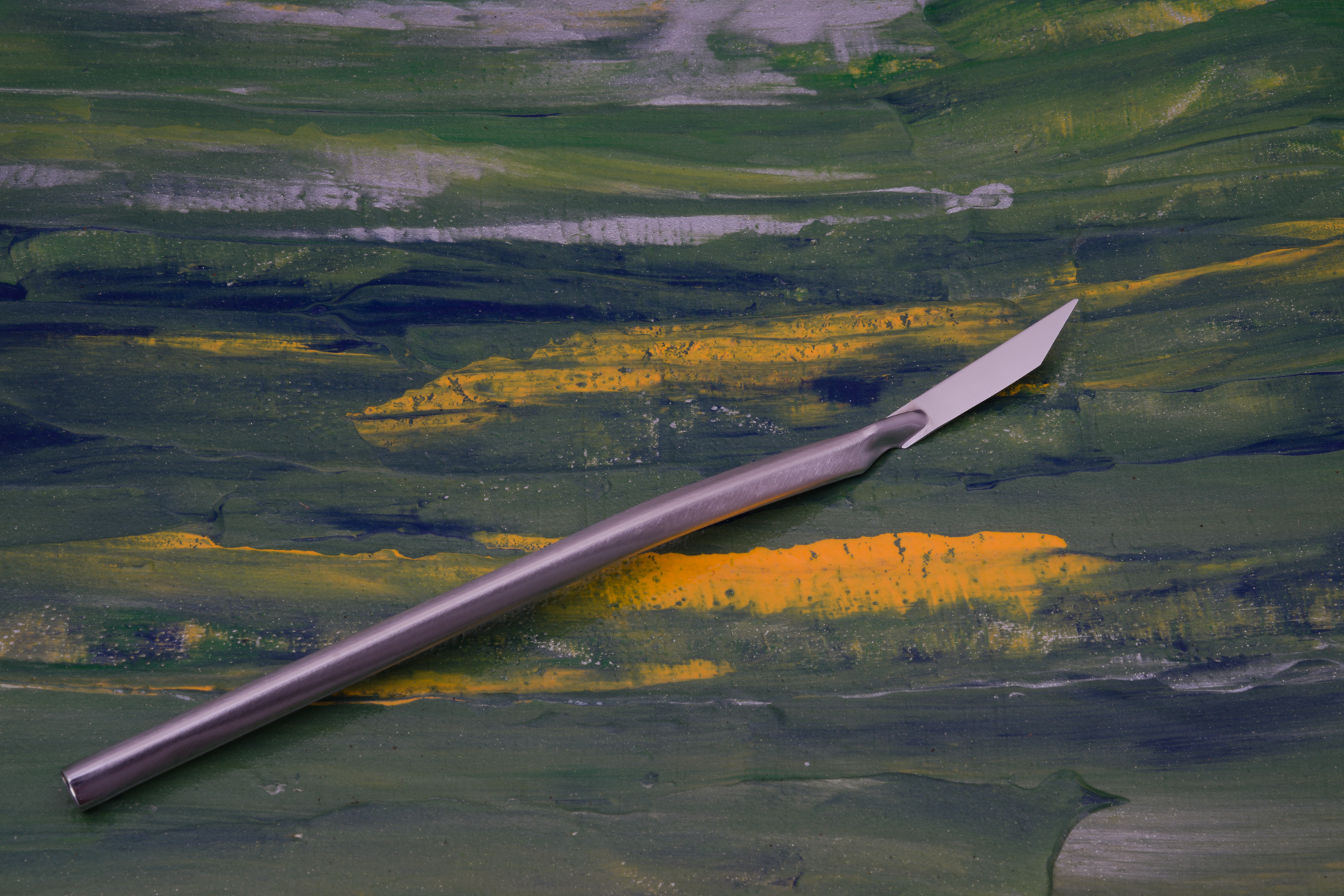 Oakblade Palette Knife for applying and moving around oil or acrylic paints. Has skewed front edge and parallel side edges .