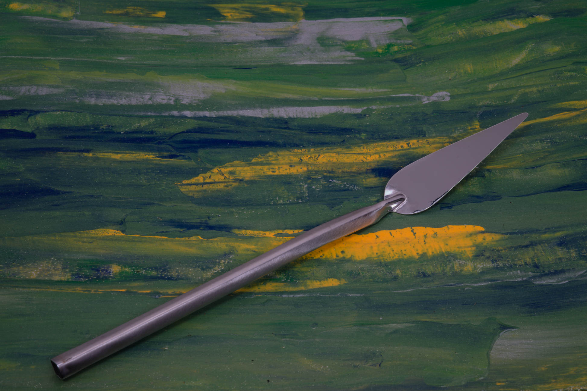 A palette knife for application of oil or acrylic paints. Versatile candle flame shaped blade!